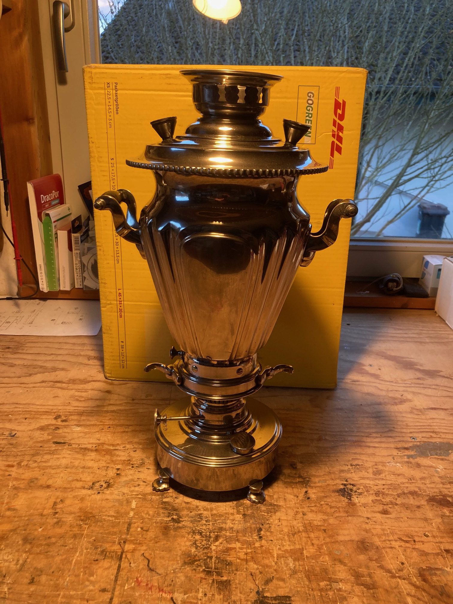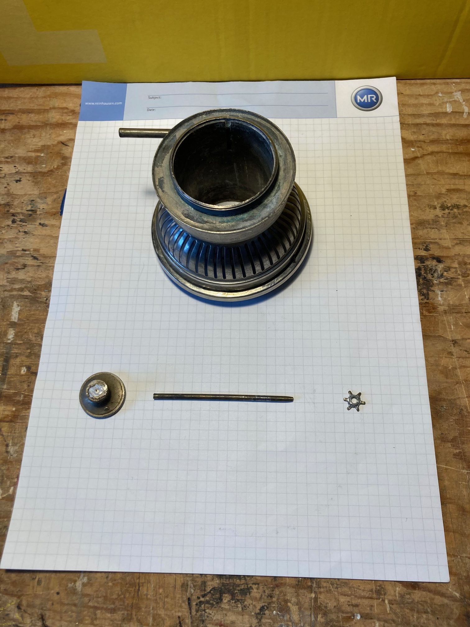 Die innere Wand (Kamin) wurde aus der Verlötung herausgelöst, die Leckstellen haben wir mit Hartlot geschlossen und den Kamin in den Corpus wieder eingesetzt mit Zinnlot.