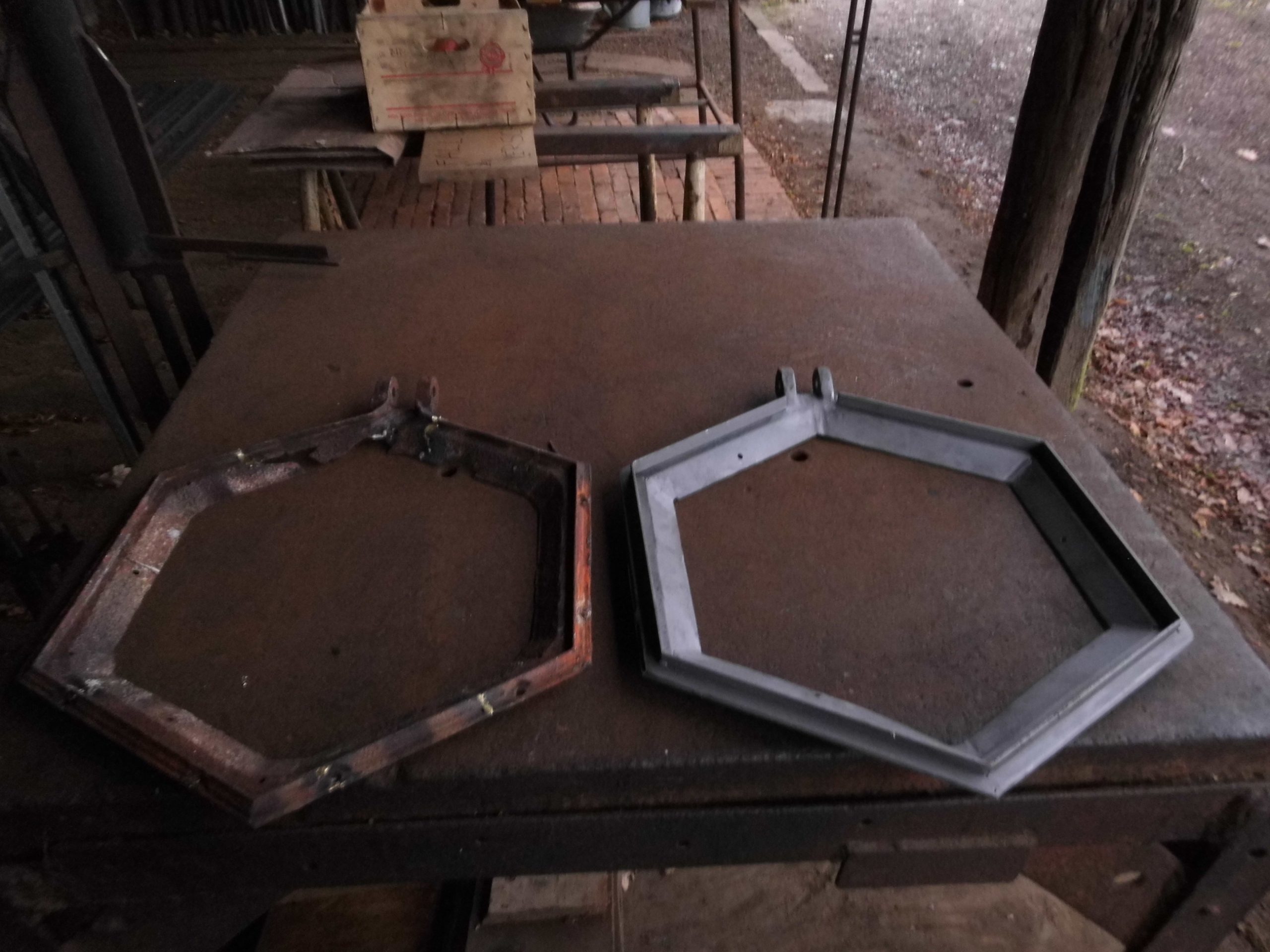Nach dem Zerlegen werden die Einzelteile durch sandstrahlen gereinigt, dann verzinkt, und einige Elemente werden vergoldet.
